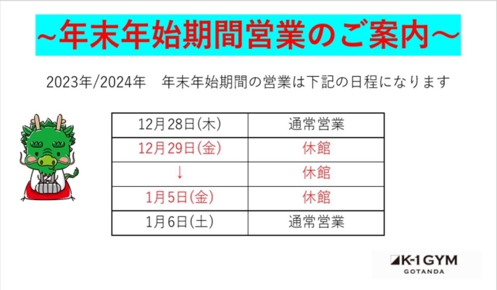 K-1ジム五反田は2023年12月28日をもちまして、本年の業務を終了いたしました。今年一年、皆様には格別のご愛顧を賜り、心より感謝申し上げます。