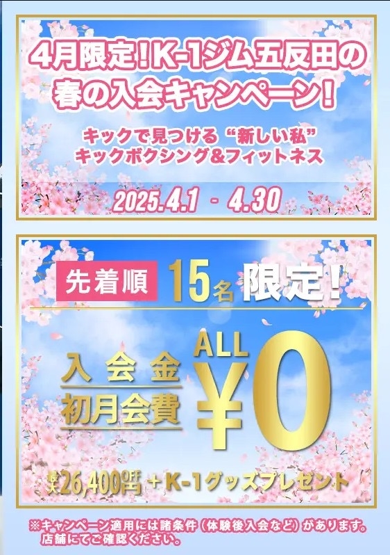 K-1ジム五反田では、 無料体験から即日入会で適用される超お得なキャンペーン を実施中!
