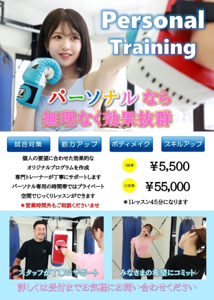 「K-1 & ボディメイク」の有酸素運動と無酸素運動を合わせたパーソナルなどお客様のご要望にお応えしたトレーニングを行っております!