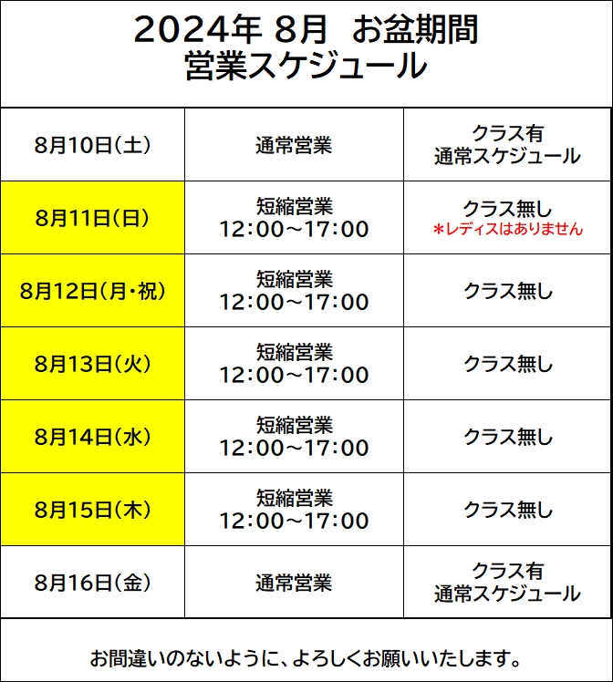 8月のジム営業は下記の通りとなりますので、お間違いのないようによろしくお願い致します。