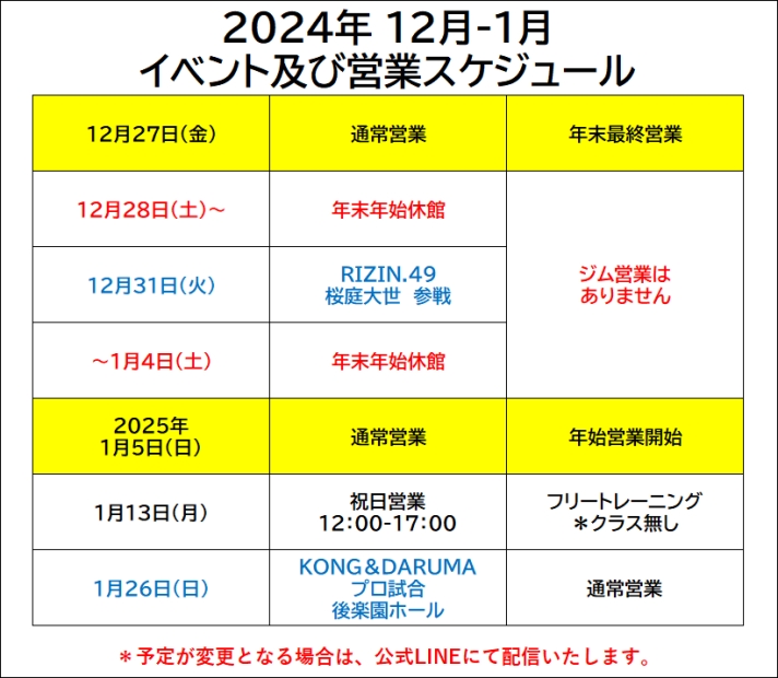 年末年始のジム営業は下記の通りとなりますので、お間違いのないようによろしくお願い致します。